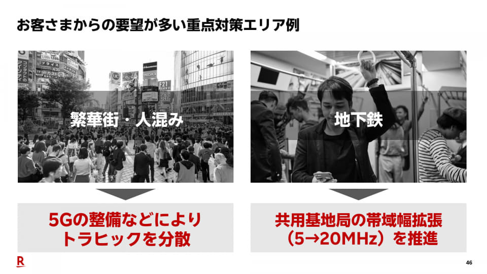 ユーザーからは、繁華街や地下鉄の品質改善が求められているという。繁華街には5G基地局を整備してトラフィックを分散させる。地下鉄では、共用基地局の帯域幅を5MHzから20MHzに拡張させることで、よりスムーズに通信できるようにする。