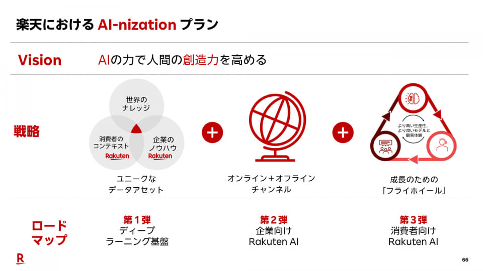 三木谷氏は質疑応答で「我々が持つ金塊であるデータをAIで活用して、サービス同士のクロスユースを進めていく」とコメント。AIコンシェルジュやAIエージェントでエンゲージメントを高めていくとともに、業務効率化も推進していくという。具体的には、コンピューターのエンジニアリングやネットワークマネージメント、コーディングの分野での成果が高いと説明。さらに、各事業にAIを推進する担当者「C“AI”O」を置き、事業の大小にかかわらずAI活用を推進、全社を挙げてAIを活用していくとした。
