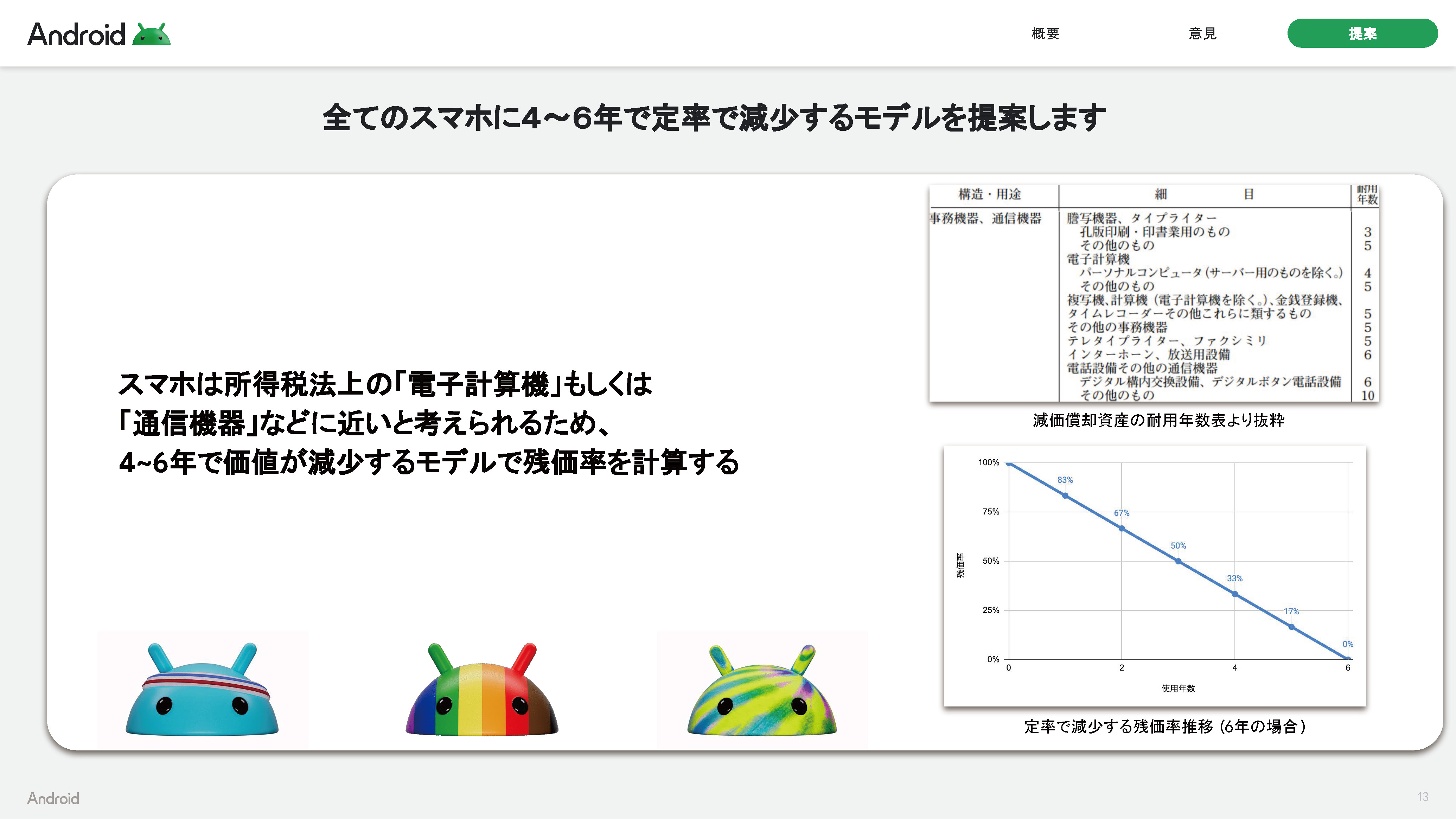 新たな残価算定方式として、全てのスマートフォンを4~6年で償却する提案した。これは、スマートフォンが所得税法上は「電子計算機」または「通信機器」に近いと考えられ、こうした機器の法定上の耐用年数が4~6年に設定されていることが根拠となっている。