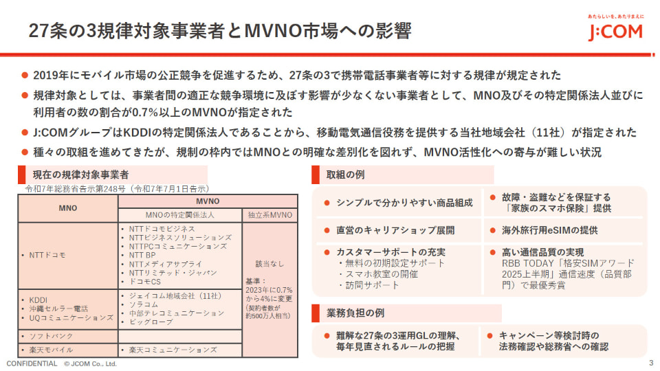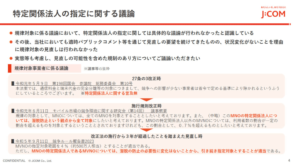 JCOMは、同社がパブリックコメントなどで見直しの要望を続けている。しかし、競争環境などに変化がないことから、特定関係法人の見直しについてこれまで具体的な議論が行われておらず、結果として独立系MVNOよりもシェアが低いにも関わらず、特定関係法人であることを理由から規制対象となっていることから、自由な競争が行えないと主張する。