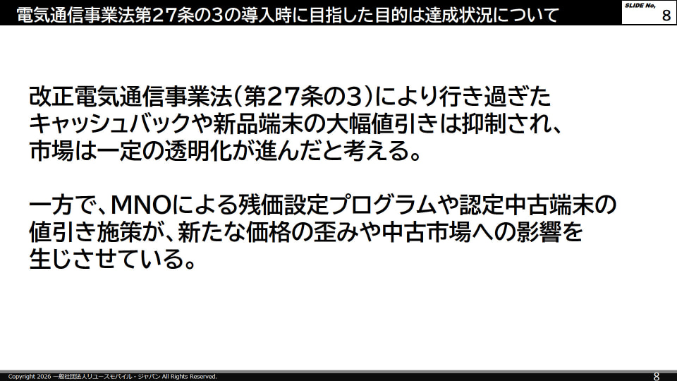 電気通信事業法(第27条の3)の改正により、過度なキャッシュバックや値引きの抑制によって一定の透明化が進んだとしながらも、MNOによる残価設定プログラムや、認定中古端末への値引き施策が、新たな歪みや中古市場への影響を生じさせていることに懸念を示した。