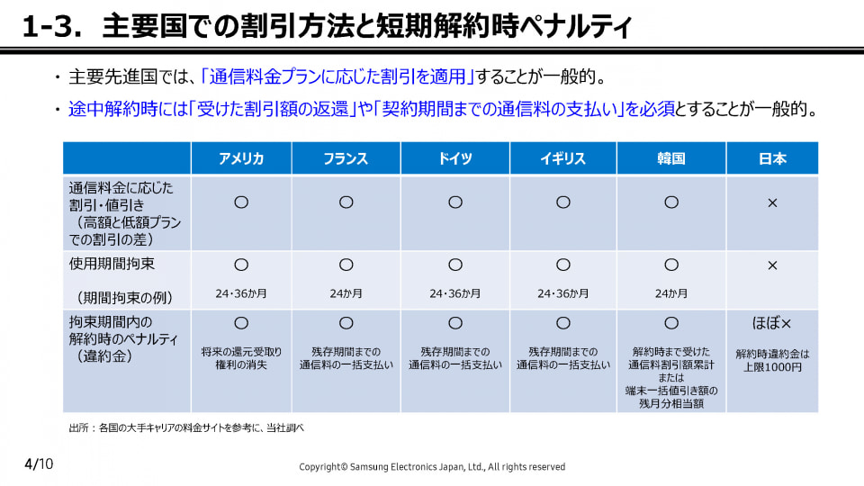 サムスン電子ジャパンは、主要国における割引と短期解約時のペナルティを比較し、日本以外では料金プランに応じた割引の適用や、途中解約時には割引額の返還や、契約期間までの通信料支払いを求めることなどが一般的であるとした。