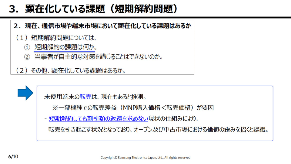 その上で、通信契約による割引が適用されたにも関わらず、短期解約をしても割引額の返還を求めない仕組みによって、未使用端末の転売が現在も続いていると課題を指摘した。
