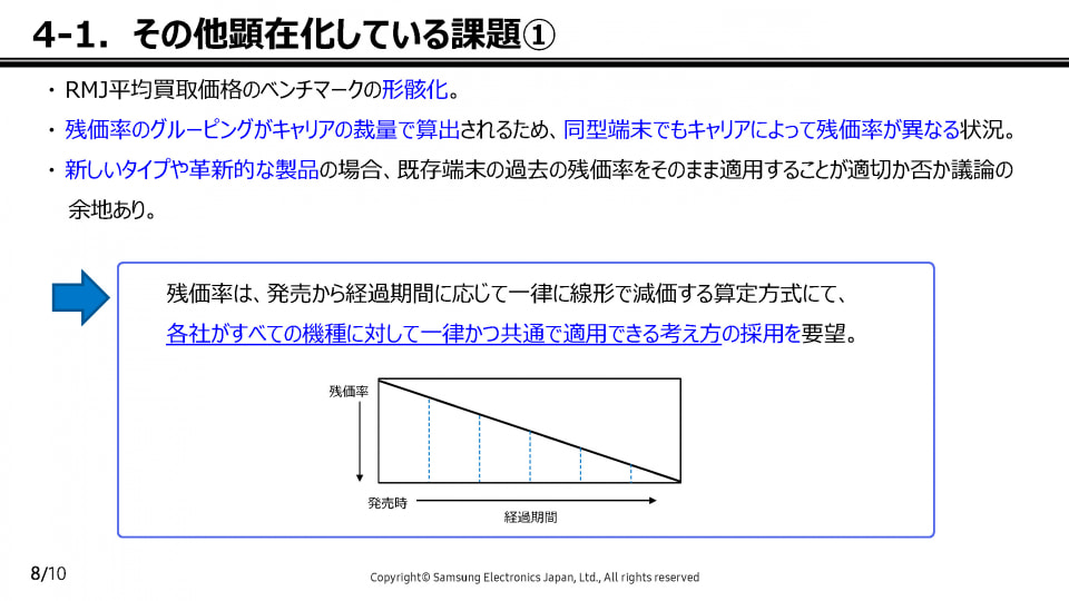 その他の課題として、RMJの平均買取価格が「形骸化している」ことを指摘した。残価率のグループ化がキャリアの裁量で算出されるため、同型端末であってもキャリアによって残価率が異なるほか、新しいタイプや革新的な製品の残価率に既存端末の残価率を適用することが適切か議論すべきと主張する。