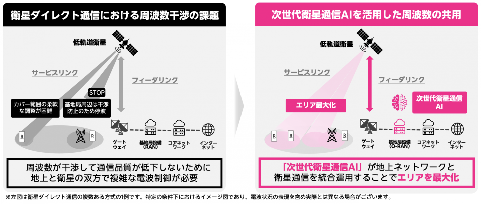 核となる「次世代衛星通信AI」は、AIを活用して衛星通信を管理・制御する機能。同一周波数帯を使用する低軌道衛星のダイレクト通信において、地上ネットワークとの干渉を回避しつつ、円滑な切り替えを図る技術の開発を進める。たとえば、エリアカバレッジ情報をもとにAIが衛星通信の停波や起動を自動制御するアプリケーションなどを実装する。災害時やユーザー移動に伴うハンドオーバー発生時でも、最適な通信環境を維持できる仕組みの構築を目指す。