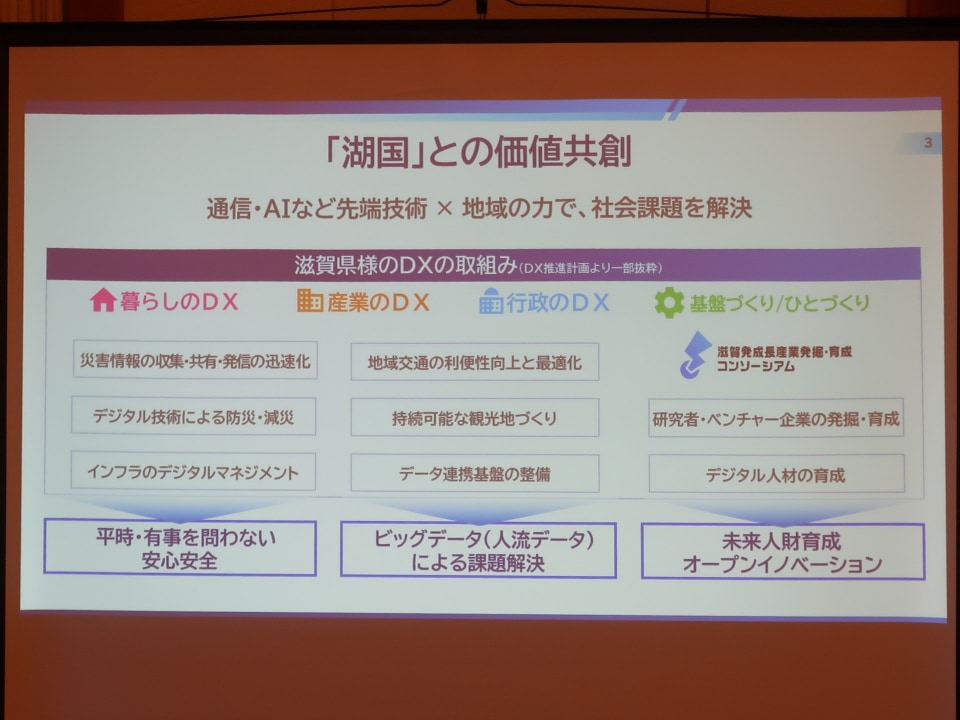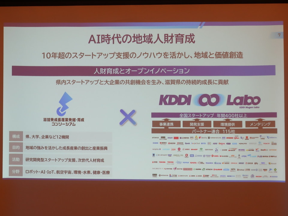 さらに、KDDIは「KDDI ∞ Labo」(KDDIムゲンラボ)などの活動を通じて、10年以上、スタートアップ支援にも積極的に取り組んできたが、滋賀県でも「滋賀発成長産業発掘・育成コンソーシアム」が活動しており、これらを連携させ、共創機会を生み出すことで、滋賀県の持続的な成長に貢献していく考えも紹介された。