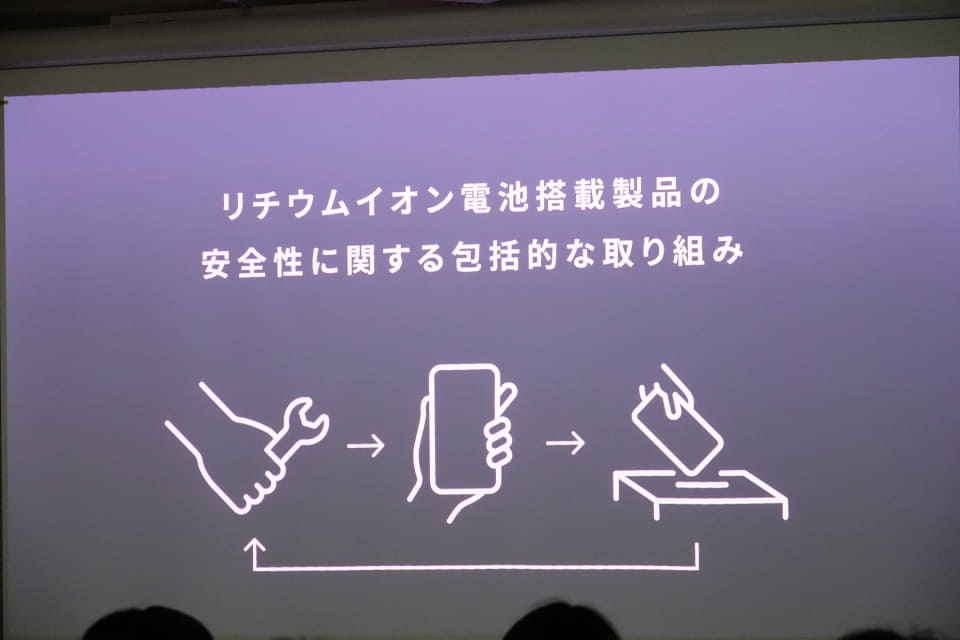 モバイルバッテリーなどリチウムイオン電池を搭載する製品では、製造工程から処分に至るまですべての段階で安全性を見直したという。