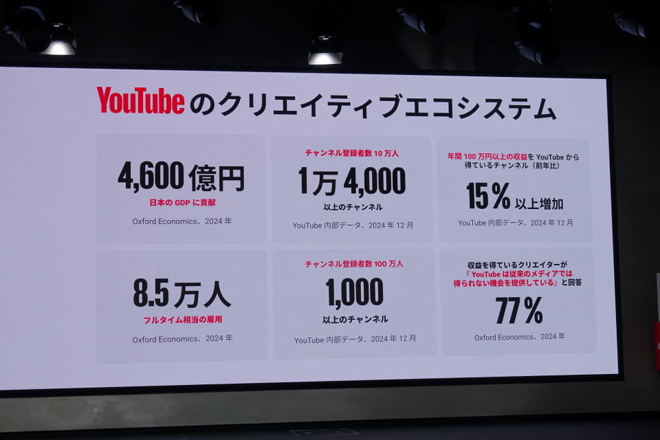 第三者機関の調査では、YouTubeが日本のGDPのうち4600億円分貢献しており、8.5万人のフルタイム相当の雇用を創出したという結果がある。このほか、チャンネル登録者数10万人を達成したチャンネルが1万4000以上、チャンネル登録者数100万人を達成したチャンネルは1000以上あると奥山氏は語る。YouTubeの収益化という点では、YouTubeから年間100万円以上の収益を得ているチャンネルは、2023年→2024年の1年間で15%以上増加しており、収益化につなげられているチャンネルが増加傾向にある。