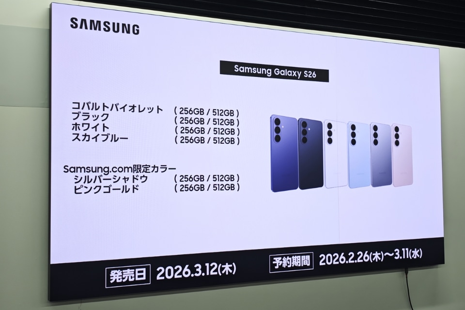 サムスン電子ジャパンは、最新Androidスマートフォン「Samsung Galaxy S26」を発表した。価格は13万6400円~で、3月12日に発売する。