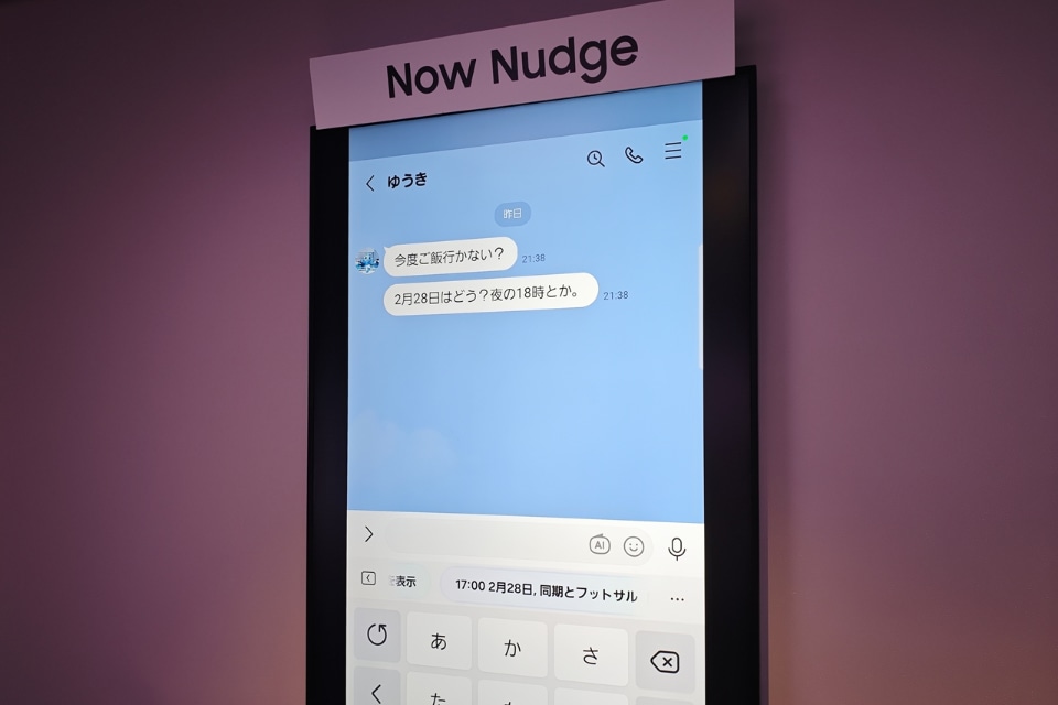 たとえば、LINEで予定を尋ねられた場合、「Now Nudge」が文脈を認識し、「カレンダーを表示」などの候補を提示するほか、予定がある場合はその予定を表示する。また、相手から「オーストラリアのディナーの写真を送って」などとメッセージを受けた場合も、Galaxy AIが内容を理解し、適した画像をギャラリーから提案する。