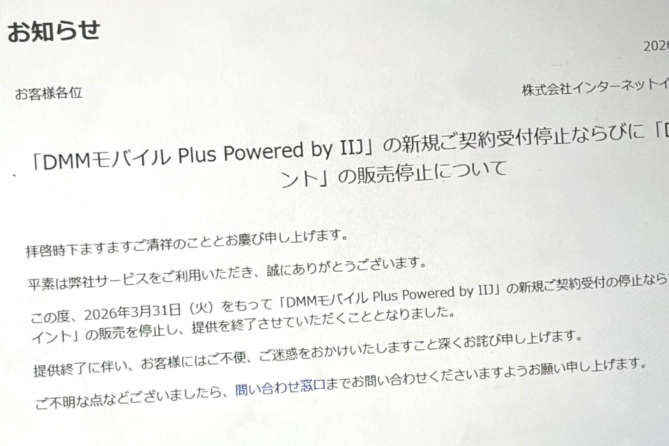 ニュース「DMMモバイル Plus」新規受付終了へ、3月末 小板橋 望実2026年2月24日 12:07 インターネットイニシアティブ(IIJ)は、MVNOサービス「DMMモバイル Plus Powered by IIJ」の新規受付を3月31日に終了する。合わせて、「DMMポイント」の販売も停止される。 今回の新規受付終了に伴う、既存ユーザーの通信サービスに影響はなく、契約済みの回線は、4月1日以降も継続して利用できる。 また、販売停止前に購入し、ユーザーが保有しているDMMポイントやIIJmioギガプランのデータ量についても、それぞれの有効期限までは引き続き利用できる。