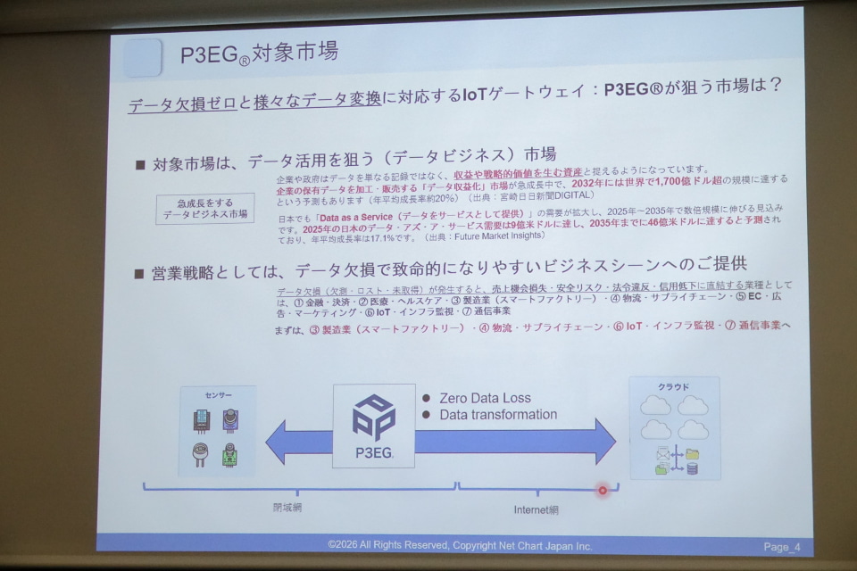 P3EGは、すでに国内外の工場やインフラ監視などで先行導入されている。ネットチャートでは、工場やインフラ点検、スマートシティなどの分野に向けて今後、2028年までに50件の販売を目指すとしている。