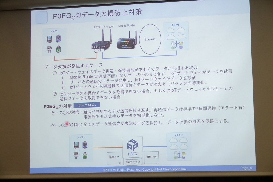 P3EGは、データ損失に対しての対策を前面に打ち出している。通信障害や通信エラーでデータをサーバーに送信できない場合やIoTゲートウェイの電源断で送信待ちデータが消失するといったケースでも、成功するまで送信を繰り返す。再送信データは標準で7日間保持するほか、電源が断たれてもデータは初期化されない。