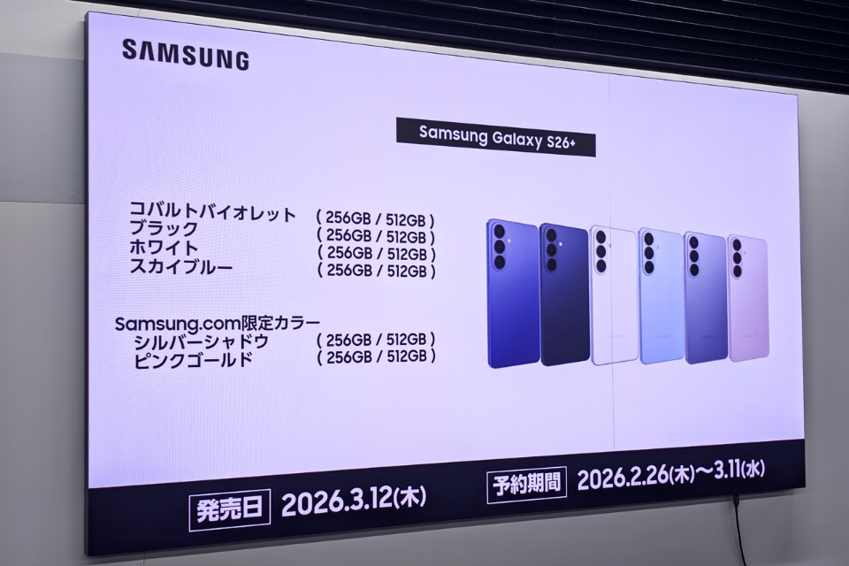サムスン電子ジャパンは、最新のAndroidスマートフォン「Samsung Galaxy S26+」を発表した。価格は16万9920円~、3月12日に発売される。