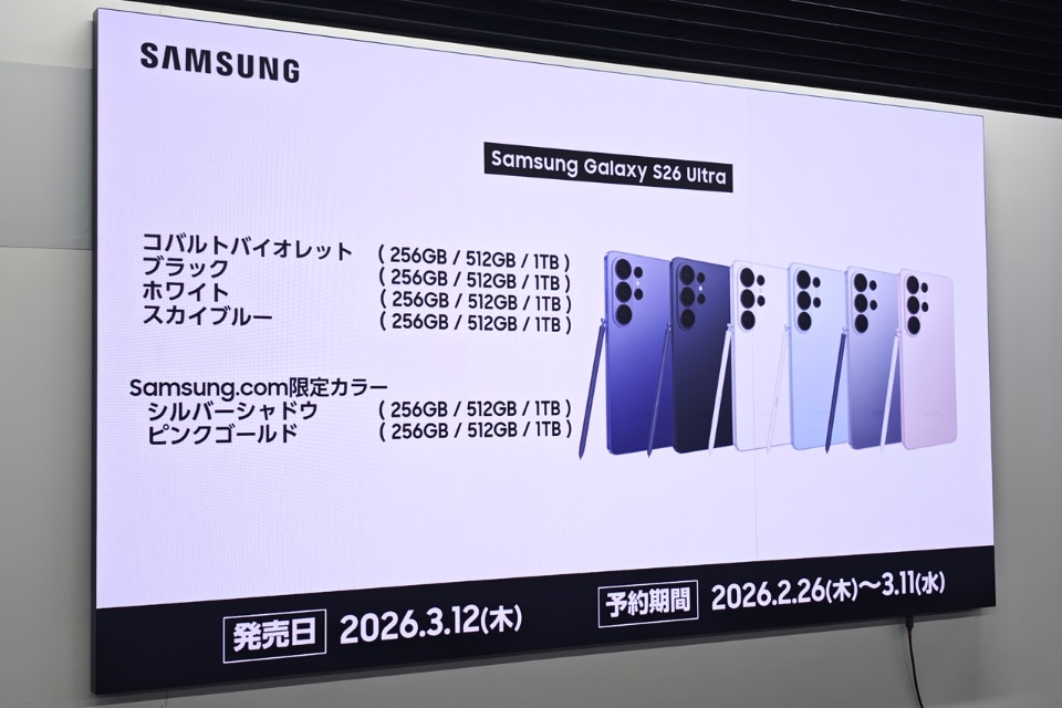 サムスン電子ジャパンは、最新のAndroidスマートフォン「Samsung Galaxy S26 Ultra」を発表した。価格は21万8900円~。3月12日に発売される。