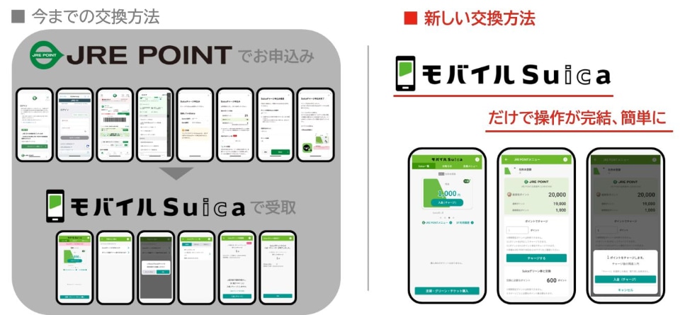 アプリ内で新たに提供される機能は、「JRE POINT保有数の確認」、「JRE POINTのモバイルSuicaへのチャージ」、「JRE POINTから(JRE POINT用)Suicaグリーン券への交換」の3つ。