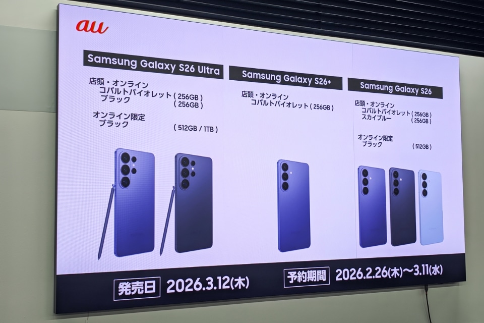 KDDIと沖縄セルラーは、Androidスマートフォン「Samsung Galaxy S26」「Samsung Galaxy S26+」「Samsung Galaxy S26 Ultra」の3機種を、3月12日に発売する。スマートフォンと衛星が直接通信できる「au Starlink Direct」や、iOSとAndroid間でのeSIM転送にも対応する。