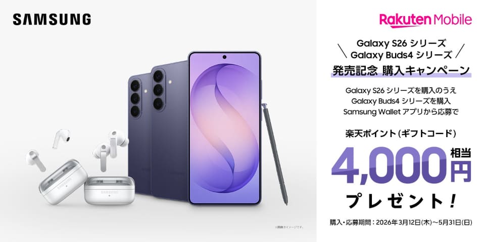3月11日までの予約期間中、楽天モバイル公式サイトまたは楽天モバイル公式 楽天市場店でGalaxy S26シリーズを予約→3月31日までに購入→「Samusung Wallet」アプリで応募すると、最大1万円相当の楽天ポイント(ギフトコード)が進呈される。