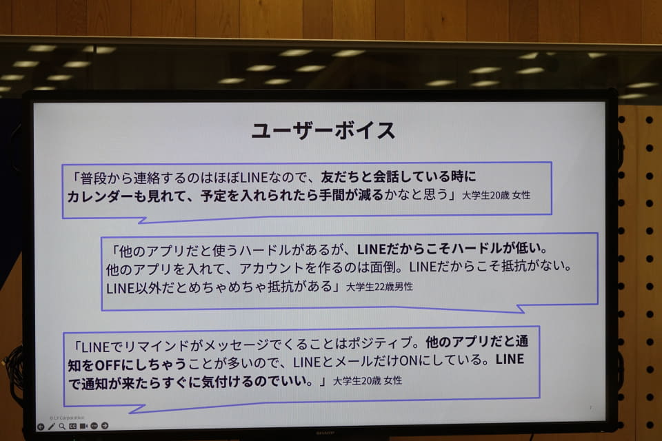 一方で、LINEで予定を立てる相談をしても、結局ほかのカレンダーアプリやユーザーの手帳で管理することになり、予定を「立てる場所」と「管理する場所」が別になっている課題があったとコメント。予定を忘れないようにしたり、相手が予定を忘れないようにする気遣いが発生してしまっていたと話す。