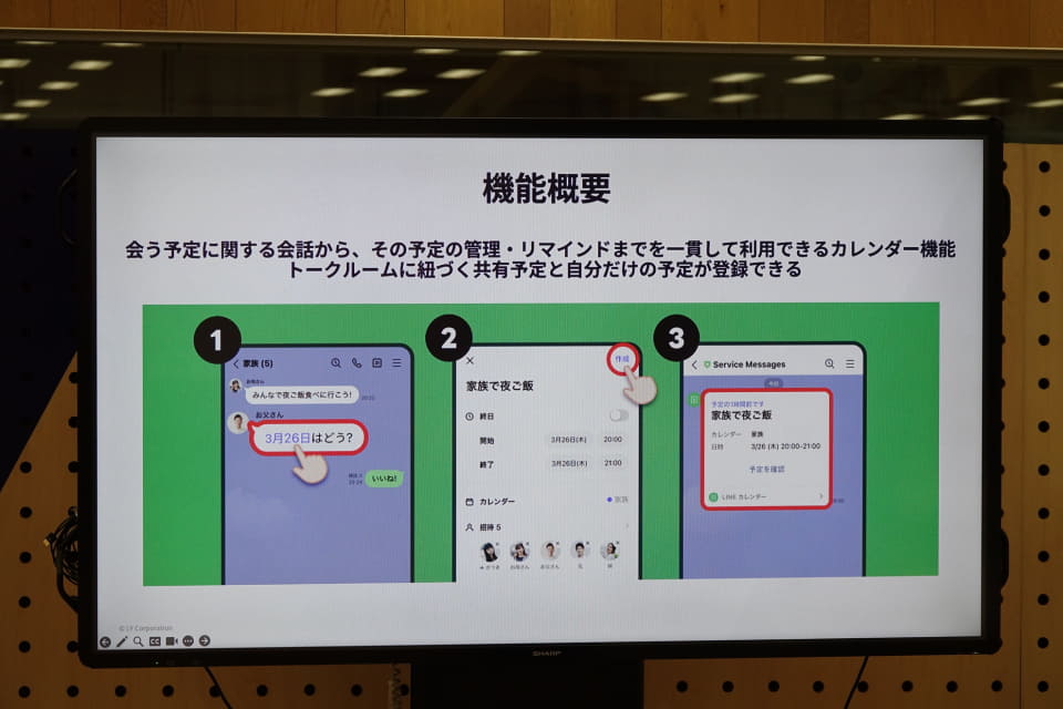 なお、3月のリリース時点では、他社カレンダーとの連携機能は備えていない。トークルーム内の日程調整機能やLINE上のさまざまな情報との連携については、今後の課題としており、ニーズに合わせてこれらの機能は順次導入するとしている。