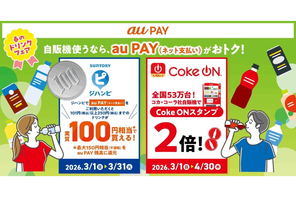 KDDIは27日、キャッシュレス決済サービス「au PAY」で、自動販売機のサービス「ジハンピ」と「Coke ON」で特典を進呈するキャンペーンを実施する。期間は3月1日から。