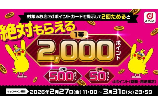 期間中、対象のdポイント加盟店でdポイントカードを提示し、1ポイント以上貯める会計を2回以上行うユーザーを対象に抽選を実施し、最大2000ポイントが進呈される。特典は、1等が2000ポイント、2等が500ポイント、3等が50ポイント。