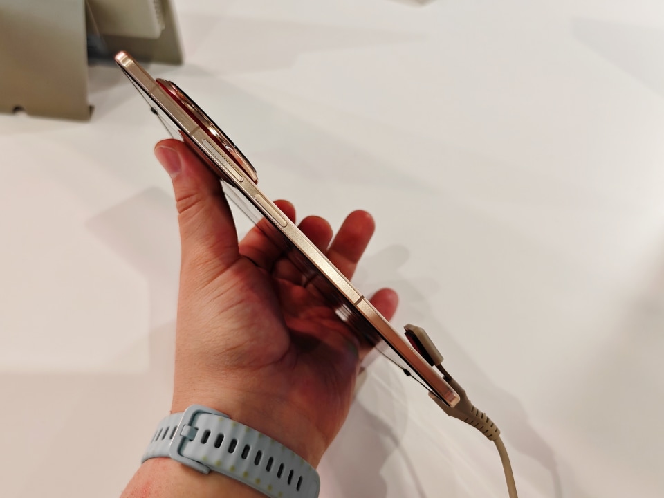 本体の厚さはわずか8.75mm。ヒンジには2800MPAの自動車用スチールを使用し、50万回の折りたたみテストをクリア。また、独自のナノクリスタルシールドにより10倍の耐落下性と15倍の耐擦傷性を実現し、IP68およびIP69の防塵・防水性能を備える。