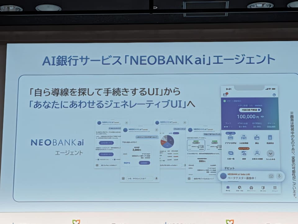 住信SBIネット銀行は、「NEOBANK ai」エージェントのベータテストを開始した。生成AIがユーザーとの対話を通じて目的を理解し、最適な画面をその場で自動生成するもの。自然言語の依頼をもとに、振込などの取引や目的に応じたユーザーインターフェースを生成して実行できるとしており、邦銀初の取り組みとなる。