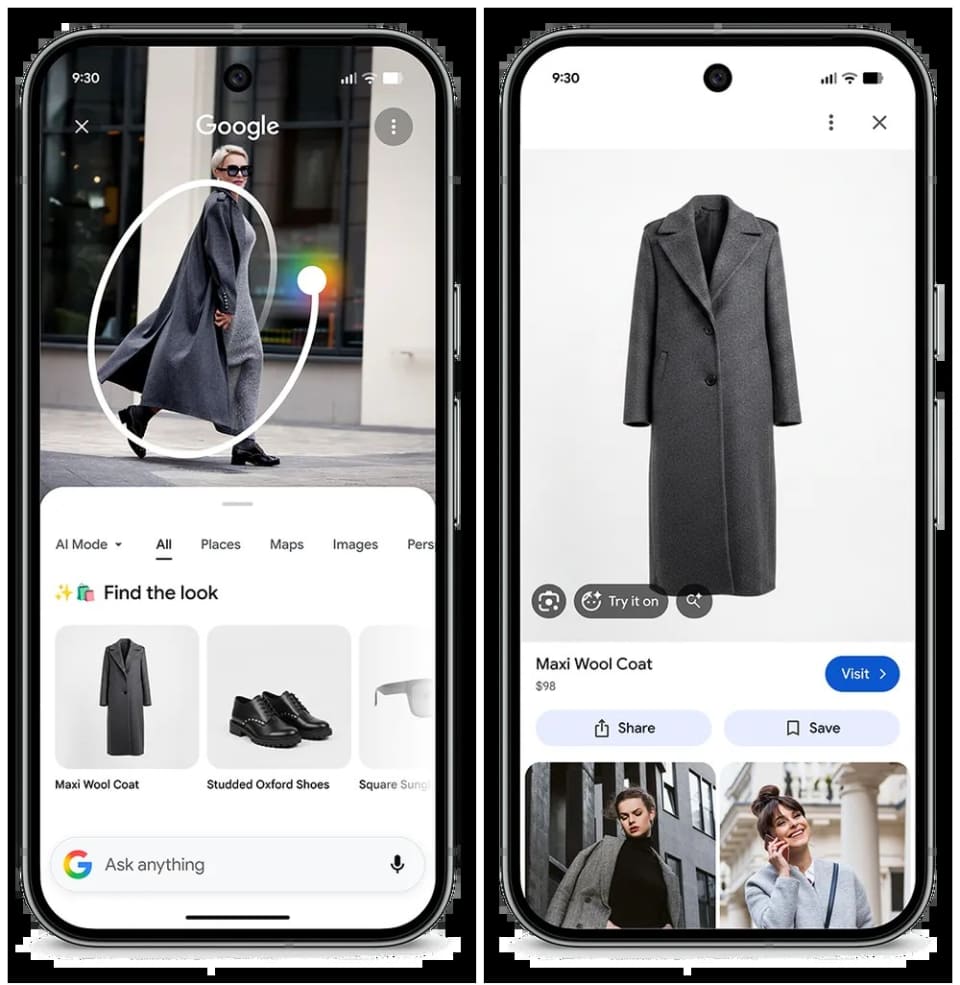 「Pixel 10」シリーズ以降の場合、コーディネート全体を丸で囲むことで、構成するすべてのファッションアイテムが一括で検索される。