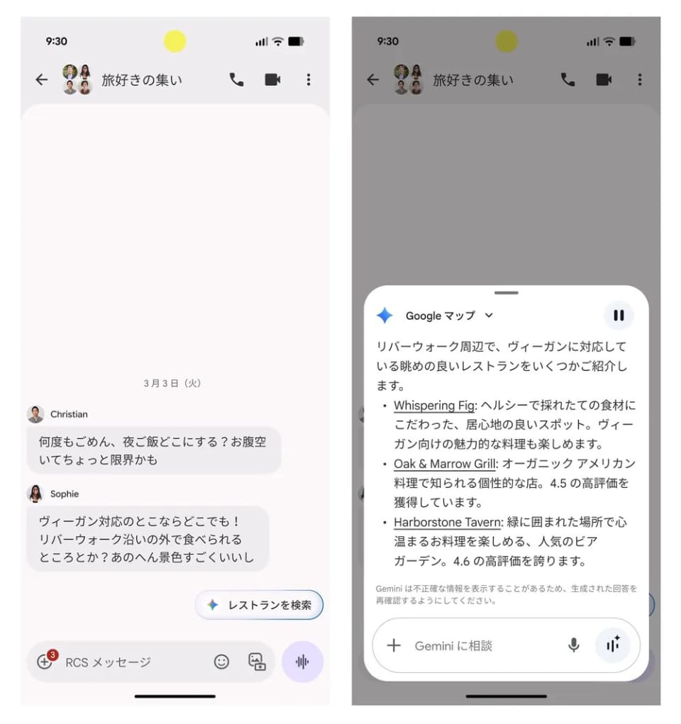 メッセージアプリで、友人などとレストランについて相談している際、「マジックサジェスト」によりGeminiを用いて最適なスポットが提案されるようになった。「Pixel 10」シリーズで利用できる。