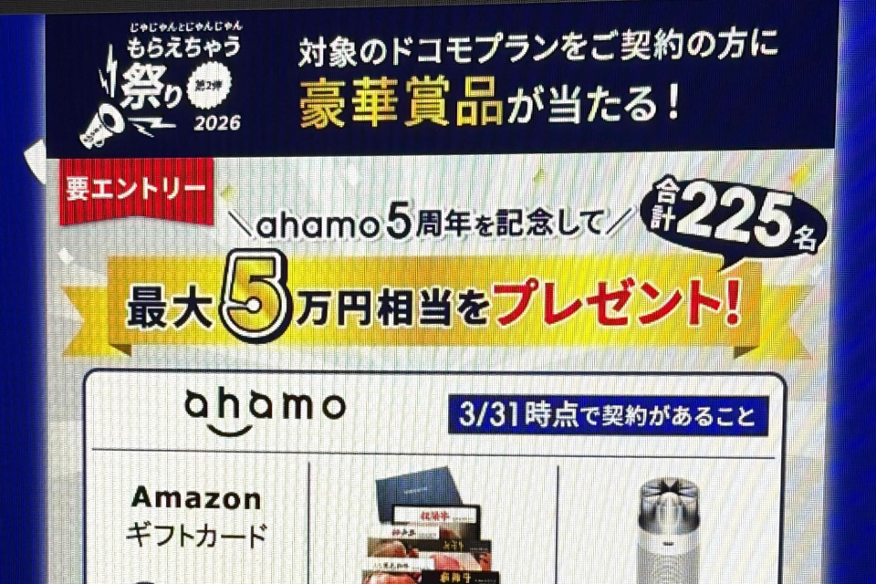 NTTドコモは、対象プランのユーザーを対象に、Amazonギフトカードや高級家電などが抽選で当たる「じゃじゃんとじゃんじゃんもらえちゃう祭り 2026~第2弾~」を開始した。期間は「ahamoコース」が3月31日まで、「ドコモ MAX/ドコモ ポイ活 MAXコース」が4月1日まで。