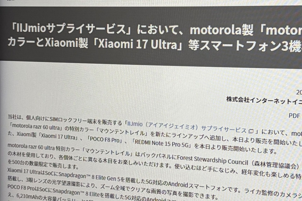 インターネットイニシアティブ(IIJ)は、個人向け端末販売「IIJmioサプライサービス」で、「Xiaomi 17 Ultra」を発売した。このほか、「motorola razr 60 ultra特別カラー」、「POCO F8 Pro」、「REDMI Note 15 Pro 5G」も発売された。