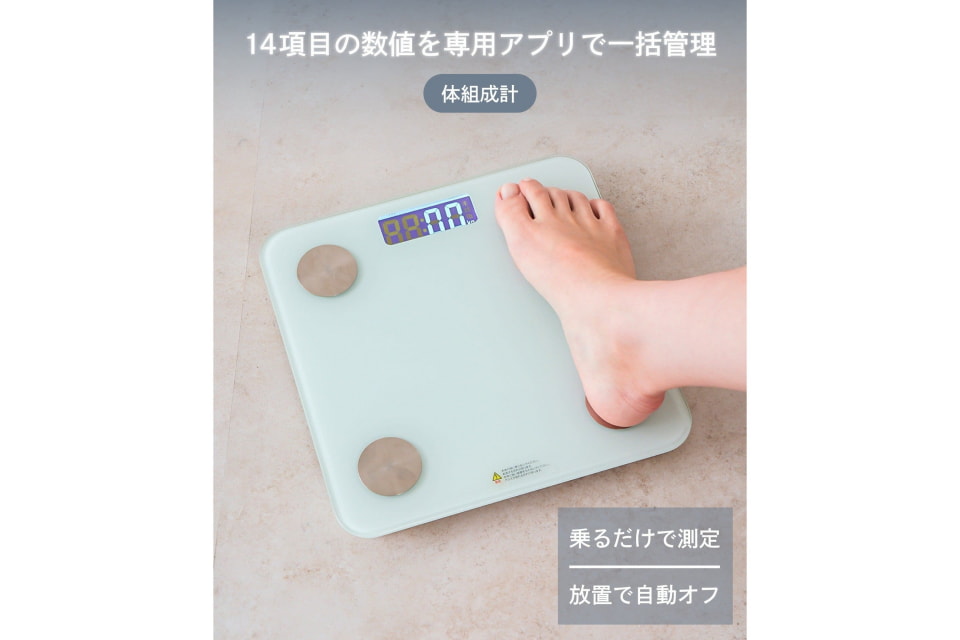 「体組成計」は、専用アプリに測定記録が転送される体組成計。本体に乗るだけで自動的に電源が入り、体重の測定が開始され、体重や体組成の推移をグラフなどで確認できる。体重や体脂肪率、筋肉量など14項目が測定可能。