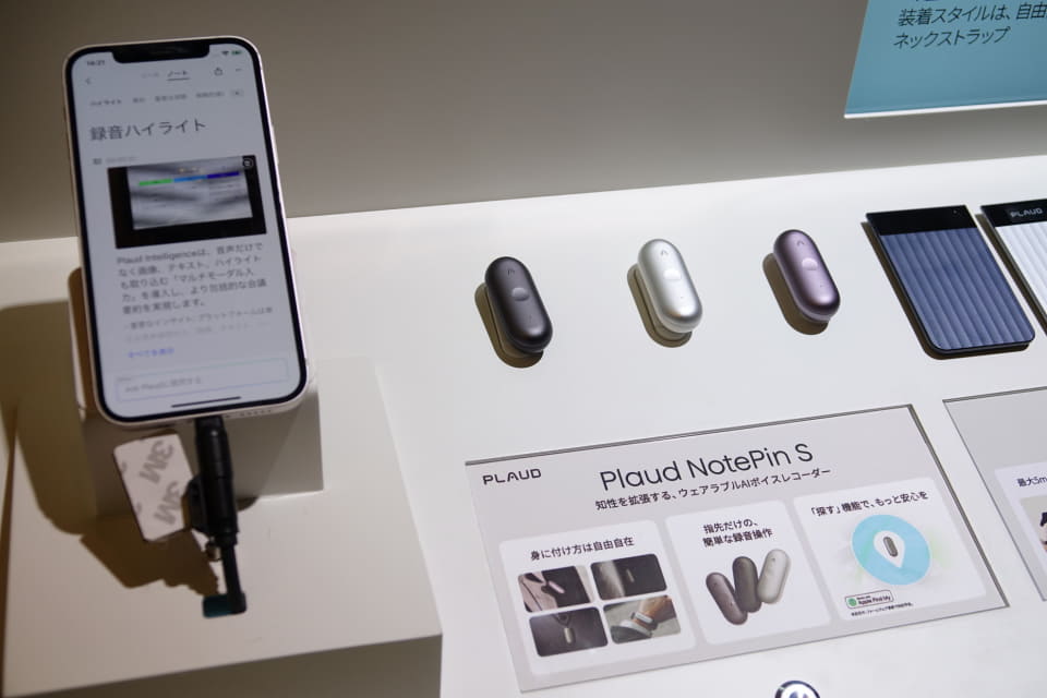 「Plaud NotePin S」は、ウェアラブル型のAIボイスレコーダーで、会議だけでなく日常の会話まで録音でき、AIが文字起こしや要約を生成することで、内容整理をサポートする。録音は、本体の物理ボタンを長押しするだけで開始できる。録音中、重要な発言があればボタンを短く押すことで「ハイライト記録」ができ、振り返る際に役立てられる。