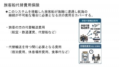 1つは「マスコミ対応費用保険」で、事故発生時の記者会見やネット上の炎上対策費用をカバーする。もう1つは旅客船に特化した「旅客船代替費用保険」で、航行不能時の代替輸送費や宿泊費、休息場所費用、食事代などを補償する。