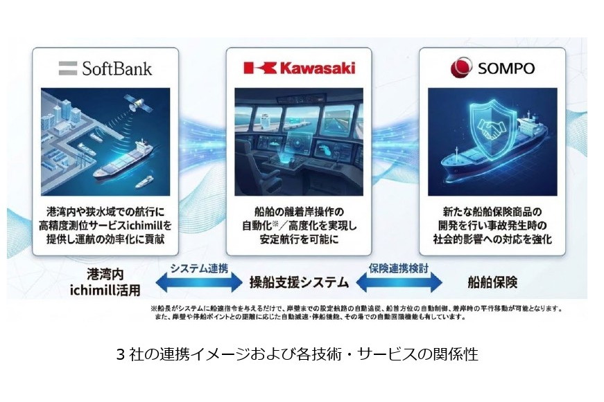 川崎重工業、ソフトバンク、損害保険ジャパンの3社は、船舶の安全運航を支援する統合ソリューションの共同開発に向けた基本合意を締結した。海運業界の深刻な人手不足や船員の高齢化、ヒューマンエラーによる海難事故などに対応する。
