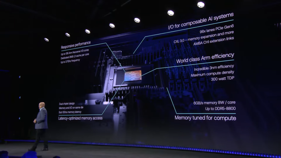 Arm AGI CPUは、1チップあたり最大136個のArm Neoverse V3コアを搭載する。各コアには専用の2MB L2キャッシュが備えられ、最大3.7GHzの動作周波数を実現する。