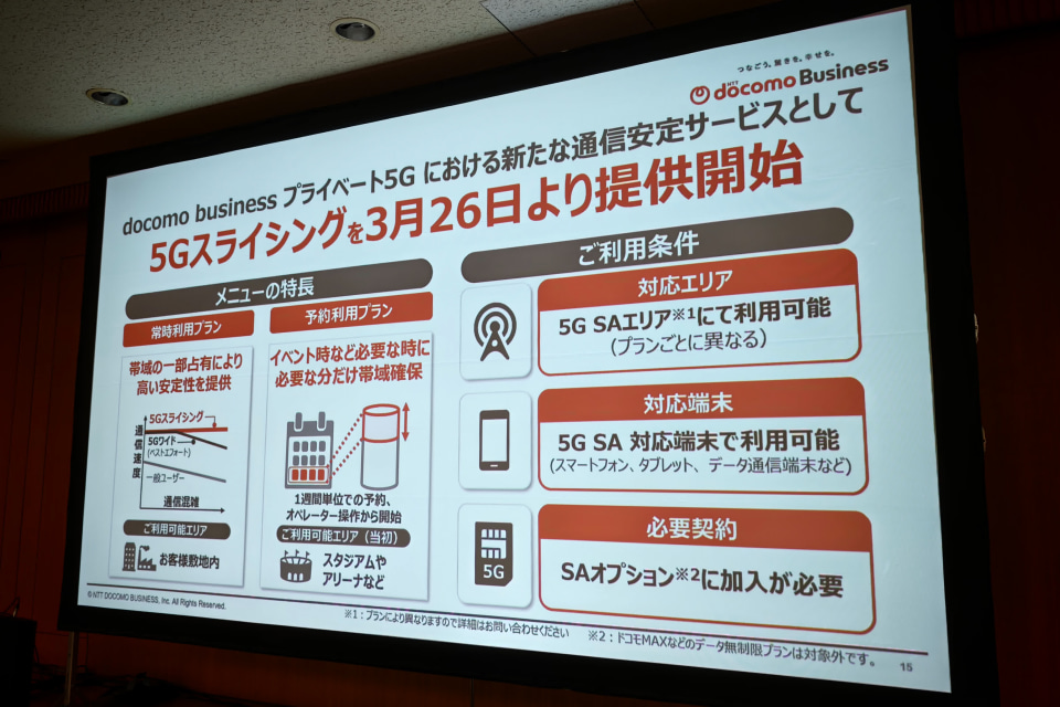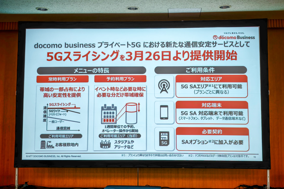 NTTドコモビジネスとNTTドコモは26日、5G SA(スタンドアローン)ネットワークを活用し、混雑時でも安定した通信を提供する法人向けサービス「5Gスライシング」の提供を開始した。