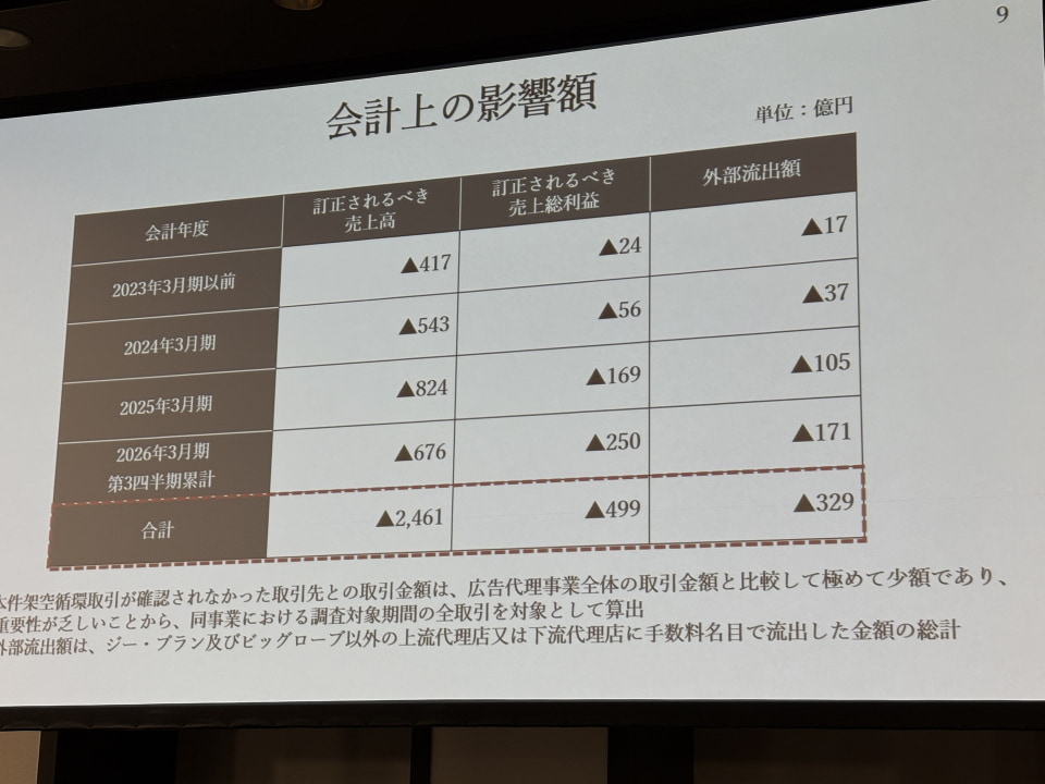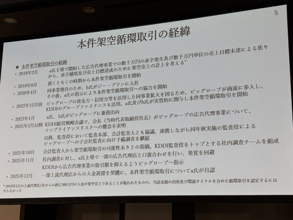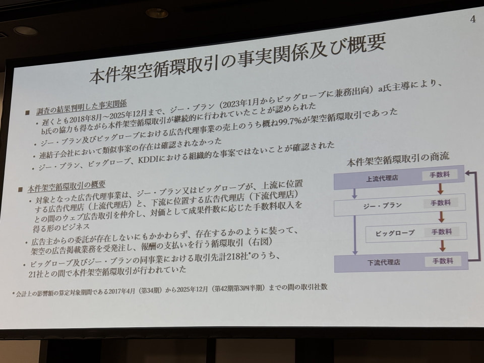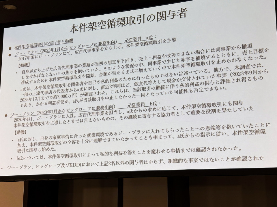ビッグローブとジー・プランでの、広告代理事業の売上のうち99.7%が架空のものだった。一方で、KDDIのほかビッグローブとジー・プランが組織的に関与した事実はなく、あくまで当該社員らの個人的な動きだったことも説明された。