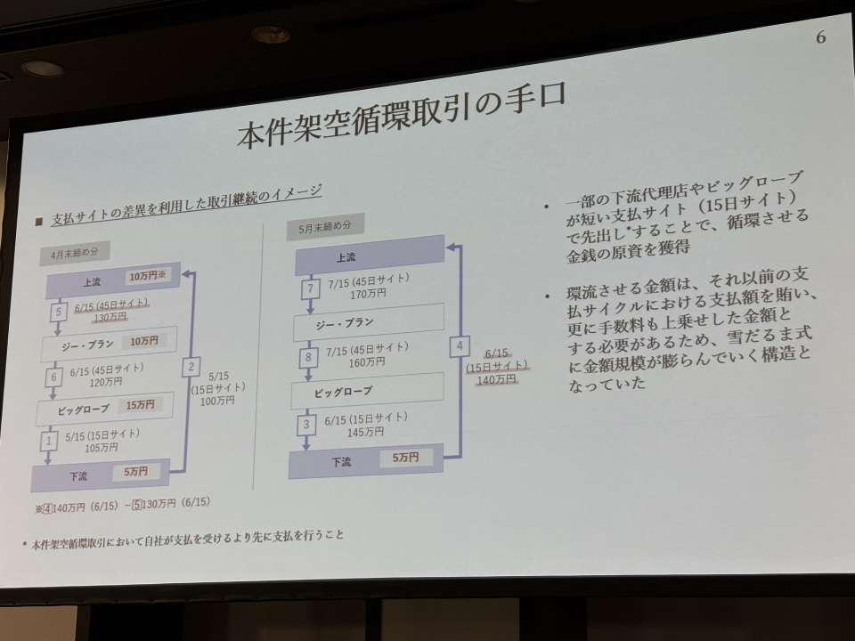 遅くとも2018年8月には、架空取引を始め、その後2020年4月に元社員Bがジー・プランに入社。Aの指示により架空取引への関与を始めた。さらに2022年12月頃には、ビッグローブの資金力や信用力をもとに事業拡大のためにビッグローブが商流に参入し、短い支払期限で先に代金を支払う「先出し」によって循環取引の原資を提供。KDDIのグループファイナンスも用いて、両社員による架空循環取引が急速に拡大した。