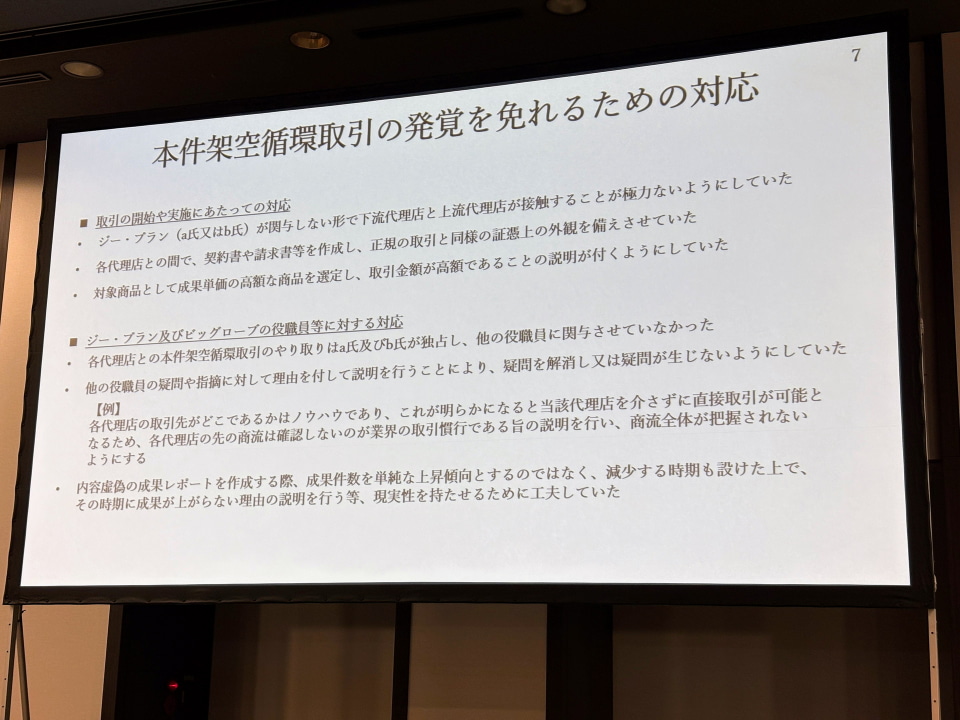 当該社員が所属していたジー・プランは、広告代理事業における知見の偏在と業務の属人化が課題と指摘。発注や支払いがすべて同一の担当者が受け持つ体制だったことから、広告主や商材の実在性が確認されなかった。加えて、信用調査会社などのデータがない場合、どのように対処するか規定がなく担当者に一任されていたことから取引先や与信管理基準も見直す。