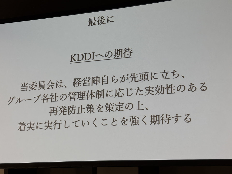 特別調査委員会の名取俊也弁護士(新丸の内総合法律事務所)は「KDDIの経営陣自らが先頭に立って、グループ各社の管理体制に応じた実効性のある再発防止策を策定の上、着実に実行していくことを強く期待している」とコメント。