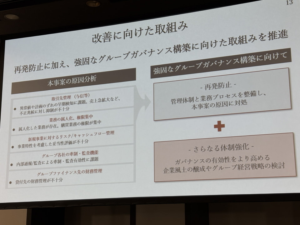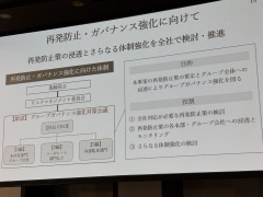 加えて「今回の事案をきわめて重く受け止めて、グループ全体におけるガバナンスの総点検を進めるとともにグループ全体がより結束を深める契機として、強靭で一体感のある企業グループに進化させる」とした。取締役会のもとに設置されているリスクマネジメント委員会の傘下にグループガバナンス対策会議を新設しており、同様の事案の再発防止やグループ全体への浸透に向けて進める。