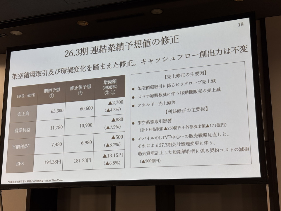 一方で、2026年3月期の通期連結業績予想については下方修正を行った。今回の架空循環取引による影響(売上高676億円減、営業利益420億円減)に加え、スマートフォン販売数の減少やエネルギー売上減などを見込み、売上高を当初予想から2700億円減(4.3%減)の6兆600億円に引き下げた。