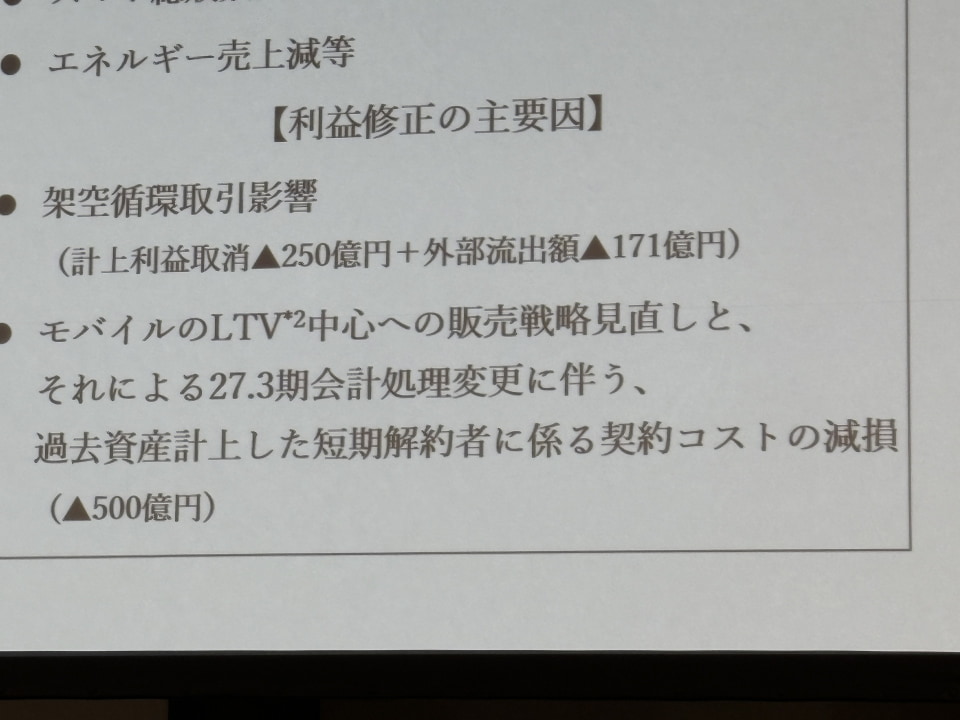 また、短期的な顧客獲得ではなく長期的な利用を重視する「LTV戦略」への転換に伴い、SIM単体契約等の短期解約者にかかる販売手数料の減損損失500億円を計上することも響き、営業利益は当初予想から880億円減(7.5%減)の1兆900億円となる見込み。