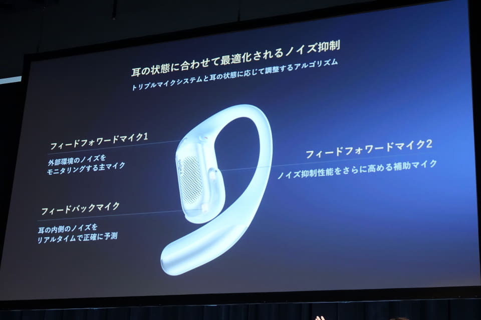 だが、耳を物理的に密閉できないオープンイヤー型の設計では、構造的にノイズを遮断できない。また、ユーザーによる装着状態のばらつきがあり、さまざまな条件でより安定したノイズコントロール性能が求められる。