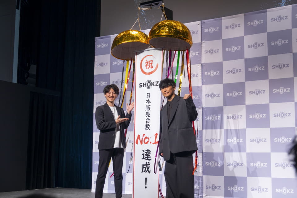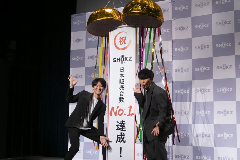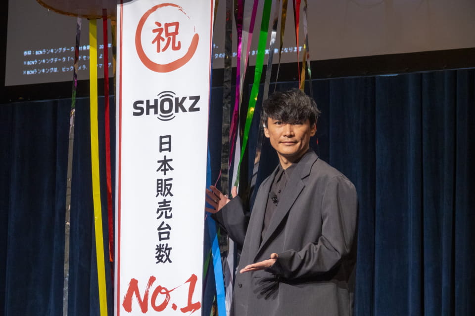 発表会の後半には、同社アンバサダーの山口一郎が登場した。まずは、同社が調査会社による「骨伝導イヤホン、および左右分離クリップ型イヤホン」ランキングで販売台数1位を記念した“くす玉割り”が行われた。山口は、「くす玉を割るのは小学生以来。お祝いムードが高まる」とコメント。同社製品については「騒音が多い飛行機の中でもバッチリ聞こえる」とノイズキャンセリング機能を評価した。
