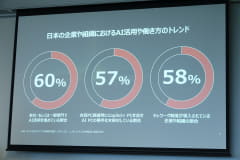 同社が調査会社に依頼した調査では、全社もしくは一部の部門でAI活用を進めている割合が60%近くに達していることがわかった。また、次回のパソコン調達時にAI PCを要件にすることを検討している割合が57%、テレワークが導入されている割合が58%で、AI PCがより一層求められてきていると指摘する。