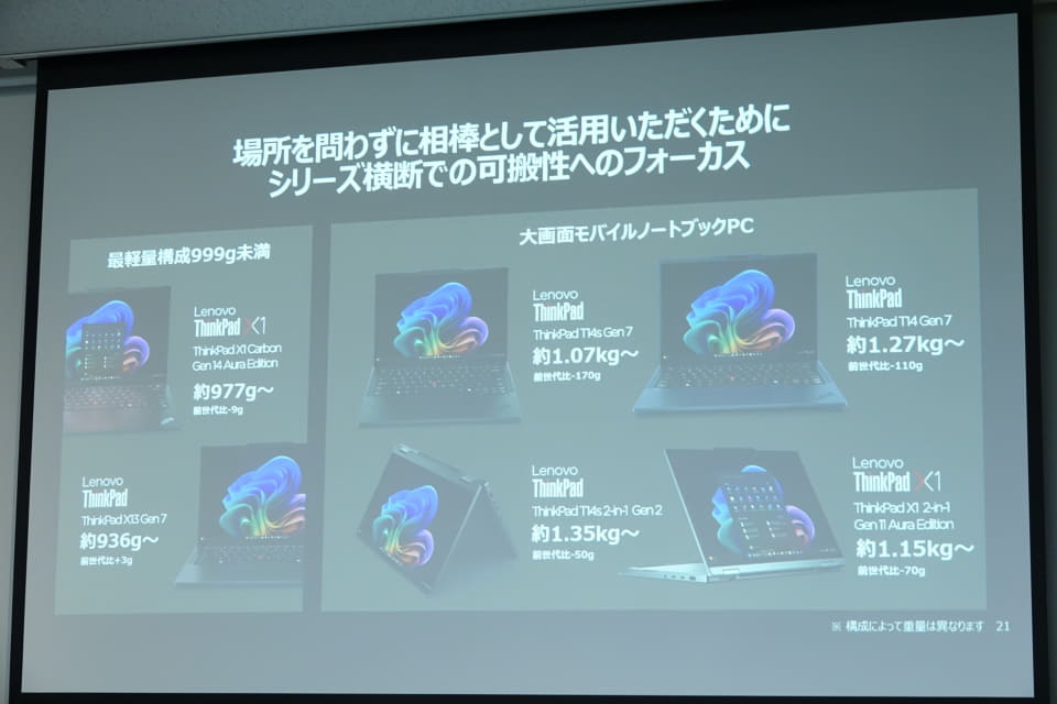また、頻繁に持ち運ぶ“可搬性”を重視するユーザーから、主にオフィスで利用するユーザーまで、あらゆるビジネスユースに対応すべく、さまざまな軽量化モデルを投入している。