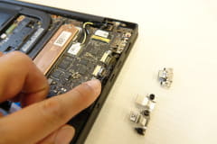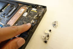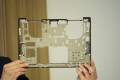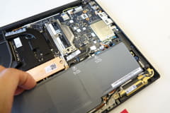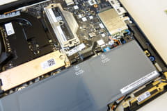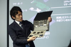 今回の構造では、本体背面だけでなく、キーボード側からもマザーボードにアクセスできるようになった。これまでは、マザーボードにモジュールを組み付ける際、本体背面側のみが利用されていたので、排熱ファンが設置される部分など、マザーボードの中でも使われない部分があった。今回の構造では、裏側も組み込めるようになったため、マザーボード全体の面積を縮小でき、そのスペースを排熱ファンやスピーカーの大型化に活用するなど、性能向上に寄与している。